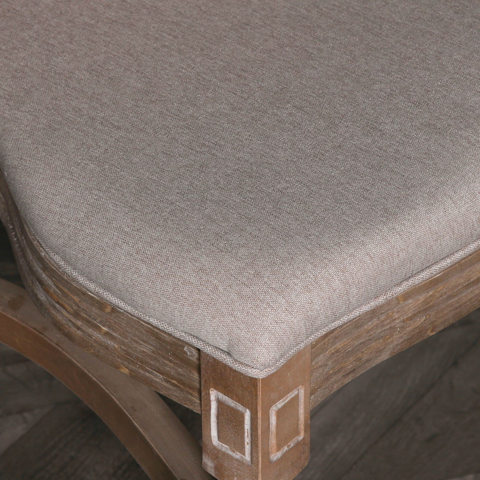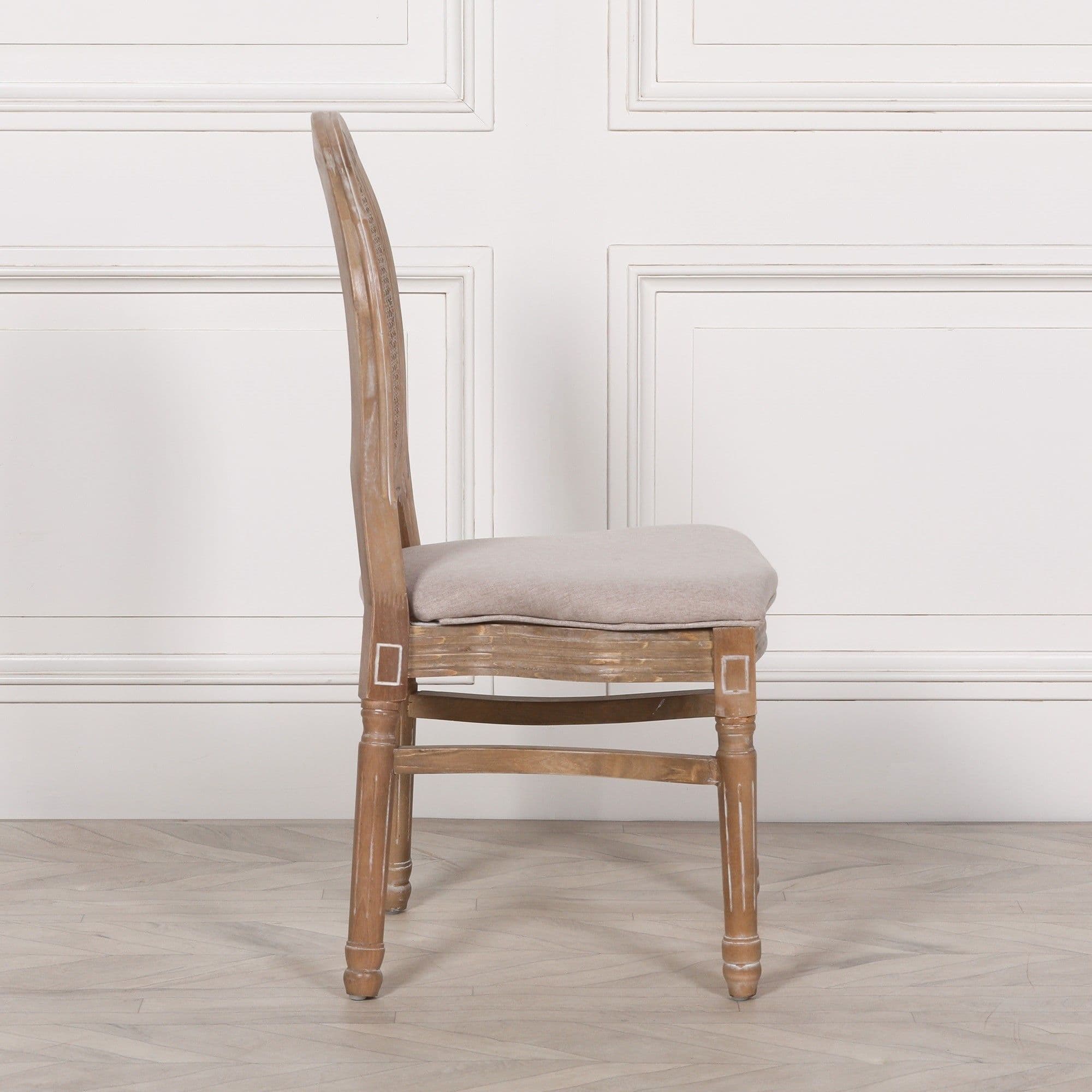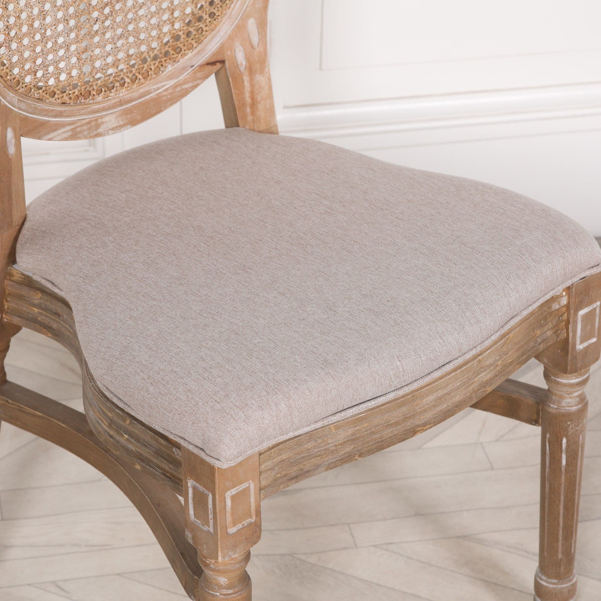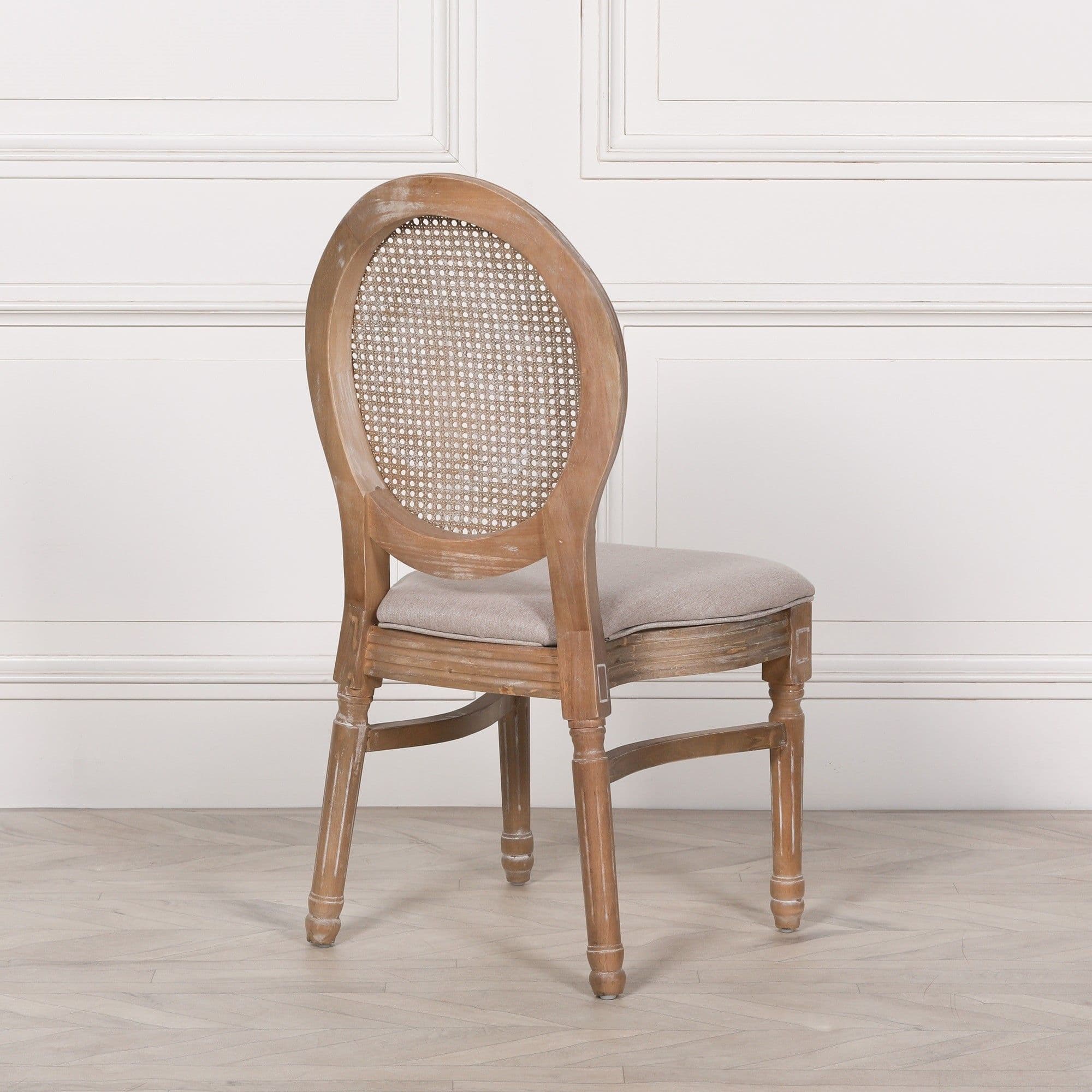 This elegant dining chair is a sensational addition to any dining area. Featuring an upholstered seat in a neutral material, an oval rattan cane back and unique carved details, finished in a light washed finish for an authentic French style distressed appeal, this chair is simply fabulous. For additional convenience this dining chair is designed to be stackable.